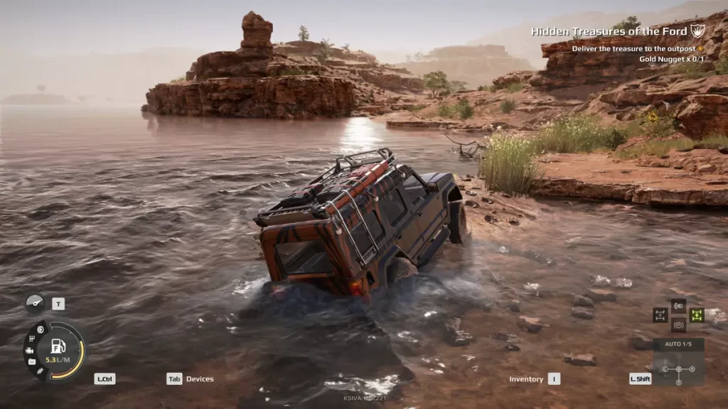 Co se týče základní výbavy, tak si s sebou vozíš dalekohled, nově potom hloubkoměr a dron. Hloubkoměr použiješ pochopitelně před každou kaluží, a označí ti třemi barvami, kudy a jestli vůbec se pustit dál. Zelenou bys projet měl, žlutou možná a červené se asi vyhni. Ale samozřejmě záleží na síle a výbavě vozidla. Dron je pak další super vychytávka, vzlétneš si tak 30 metrů nad auto a můžeš s ním pak vyhledat jakoukoliv přístupovou cestu a nebo odhalovat další různé objevy, za které na konci mise získáš peníze.