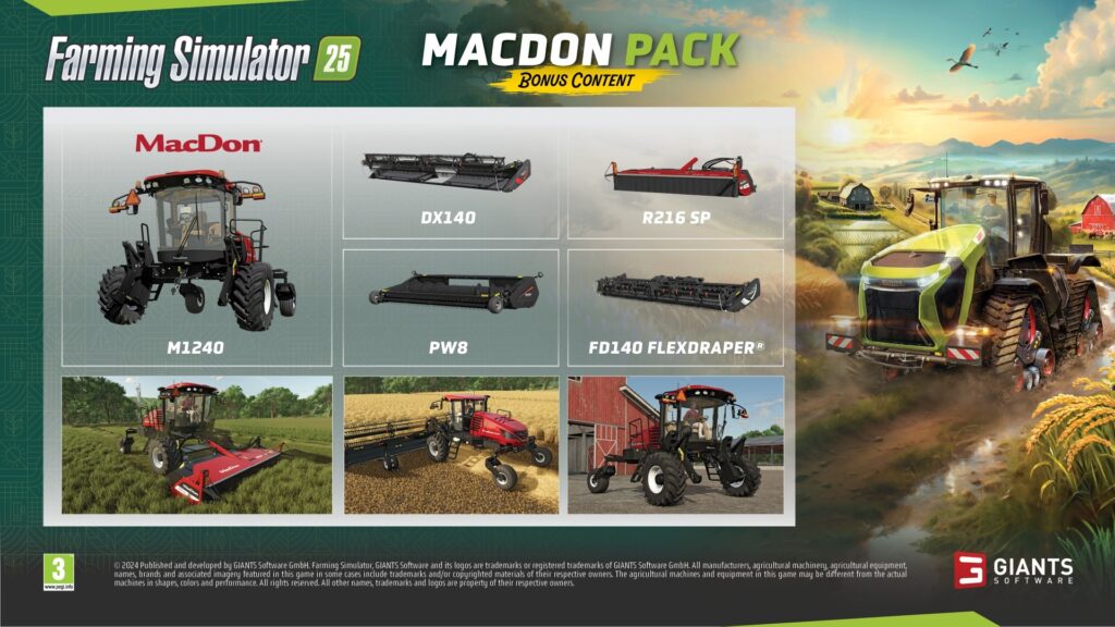 Společnost MacDon přináší novou úroveň výkonu při sklizních díky pěti špičkovým strojům obsaženým v balíčku MacDon Pack pro Farming Simulator 25! Pořiď si od kanadského výrobce sklizňové techniky řádkovač M1240, řezačky DX140 a FD140, řezačku PW8 a řezačku R216Sp.