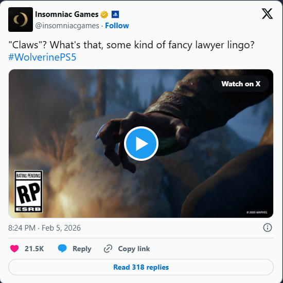 Insomniac Games rozvířili spekulace kolem očekávané akce Marvel’s Wolverine jedinou krátkou zprávou na sociálních sítích. Studio zveřejnilo obrázek Wolverina s vysunutými adamantiovými drápy a doplnilo ho popiskem: „Claws? What’s that, some kind of fancy lawyer lingo?“ – slovní hříčkou narážející na právnický termín „clause“.
